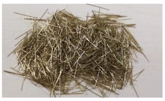 Premix powder material provided from third party company (Beirong Circular Materials Co., Ltd., Yingtan, Jiangxi, China) were used to ensure the concrete grade in each batch. The premix powders contained the basic components needed for UHPFRC (cement, fine sand, silica fume, and quartz). Straight steel fibres (as shown in Figure 1) covered with a brass coating were added in the mix. The diameter and length of fibres were 0.25 mm and 12.5 mm respectively, given an aspect ratio of 50. The uniaxial tensile strength of the fibres can go up to 2850 MPa. Polycarboxylate superplasticizer was added to ensure the workability. Detailed mix proportions are presented in Table 1.