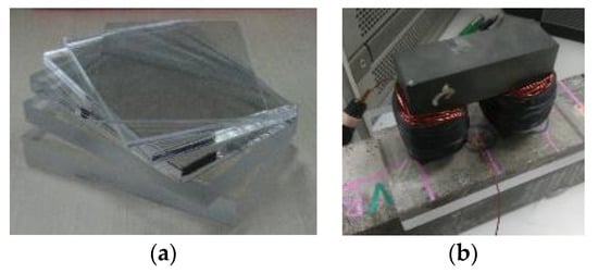 Non-ferromagnetic object like wood, plastic, and glass did not show any impact on the inductance data. By placing 100 mm × 150 mm non-ferromagnetic acrylic plates (Figure 4a) with different thicknesses (0, 2, 4, 8, 12, 15, 17, 20, 24, 28, 32, and 36 mm) between the specimens and the magnetic probe (Figure 4b), the magnetic inductance data can be measured and the relative magnetic permeability (RMP) µ can be calculated as: