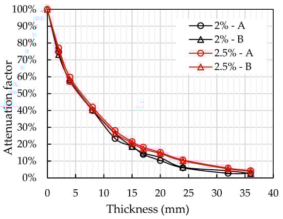 Attenuation factors of 2% and 2.5% vol. specimens at different thicknesses.