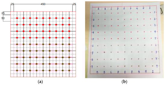 The magnetic probe test of all the plates were tested right after finishing curing. The bottom surfaces during casting were used as the testing surface as they were smooth and flat. Considering the length of the magnetic probe was 93 mm, the 500 mm × 500 mm plates were labelled on a 9 × 9 grid from A1 to I9 at equal distances of 50 mm (Figure 6a). A paper testing map (Figure 6b) with 81 points highlighted in red was made to accurately locate the testing points.