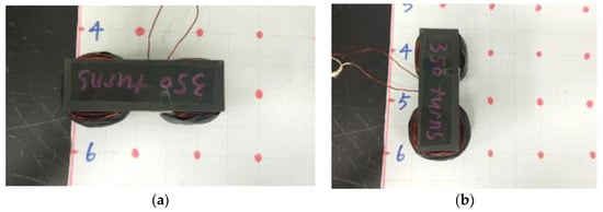 A magnetic probe was manufactured based on Nunes’ research []. The probe (Figure 3a) was made of a high frequency inductive Mn-Zn ferrite core wrapped by 350 turns of 0.9 mm diameter enameled copper wire, then tightened by black insulated rubber tape to protect the safety of users. The ferrite core used in this research was 76 mm tall, 93 mm long, and 30 mm wide. Detailed dimensions of the magnetic probe can be seen in Figure 3b.
