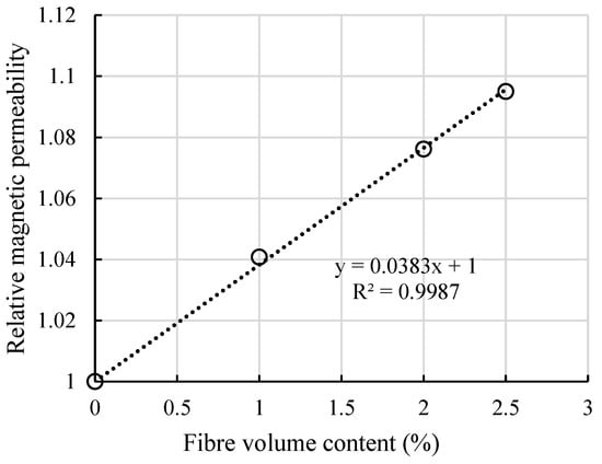 Combining the results from Table 5 and the results from Nunes et al. [], a relationship between fibre volume content and theoretical relative magnetic permeability µ can be derived as shown in Figure 8. When fibre volume content is 0, the relative magnetic permeability value equals to 1, which represents the magnetic permeability of air. The R-squared value of 0.9987 shows a nearly perfect linear fitting.