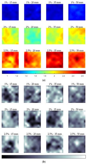 The first coloured contour plot in Figure 9a describes the fibre distribution of all plates at a unified scale. Colours ranging from blue to red represent the differences of fibre volume content. It can be seen directly that plates 2%–20 mm and 2.5%–15 mm have a lower fibre volume content than the designed fibre volume content. The detailed fibre distribution cannot be visualized, since the range of data was too wide in the coloured contour plots. Thus, a greyscale contour plot is given in Figure 9b as a comparison. The darker shading indicates a lower fibre volume content. It can be seen that there was no obvious fibre spatial distribution trend in the middle area of each plate, only the four boundaries appeared to have a lower fibre volume content. This mainly results from the limitation of the testing area (boundary effect).