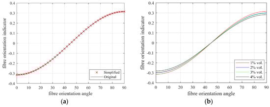 Figure 10a shows the comparison between the original fibre orientation indicator calculated using Equation (13) and the simplified orientation indicator calculated using Equation (14). No obvious difference can be observed from 0 to 90°. Therefore, the original equation can be replaced with the simplified equation. There also works with other fibre volume percentages.