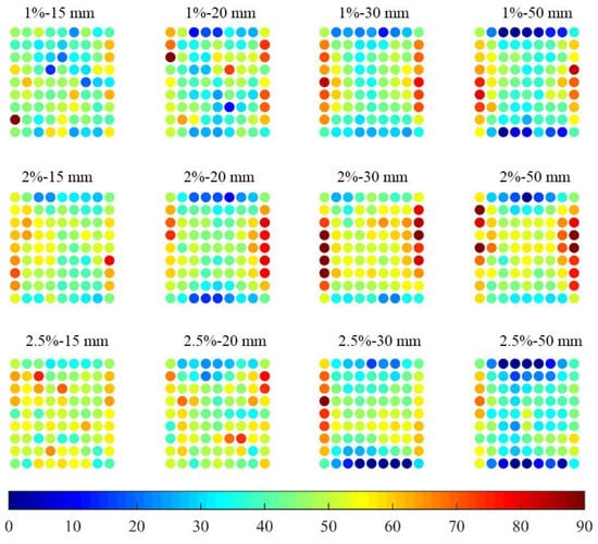 By using Equation (18), the fibre orientation distributions can be characterized. Figure 11 shows the fibre orientation distribution of all plates. Instead of contour plots, the fibre orientation angle is represented by dots in different colours. The fibre orientation ranged from 0 to 90° from the horizontal axis. It can be seen that fibres tended to orient at 0° at the top and bottom boundaries, while orienting at 90° along the left and right boundaries. There are two possible explanations: firstly, fibre tends to align their orientation to the mould due to the wall effect of the plate mould boundary; and secondly, fibre contents at the four boundaries were lower compared to other parts, which resulted from the testing method. The vertical testing value at the top and bottom points and the horizontal testing value at the furthest left and right points were lower.