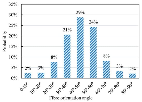 Figure 12 shows the distribution of fibre orientation angle based on 972 (9 × 9 × 12) sample points. It can be seen from the graph that under this specific casting method, the distribution of the fibre orientation angle generally follows a normal distribution and most fibres orient at an angle between 40° and 50°. The normal distribution function was calculated based on the mean and standard deviation values of fibre orientation angle, which can be represented as: