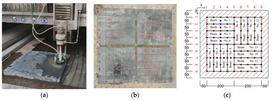 All the 500 mm × 500 mm × 15 mm, 500 mm × 500 mm × 20 mm, 500 mm × 500 mm × 35 mm, and 500 mm × 500 mm × 50 mm plates were firstly cut into four sections by water blade to maintain the accuracy of dimension (Figure 13a,b). Then, the 250 mm × 250 mm × 15 mm, 250 mm × 250 mm × 20 mm, 250 mm × 50 mm × 35 mm, and 250 mm × 250 mm × 50 mm plates were further cut into 200 mm × 50 mm × 15 mm, 200 mm × 50 mm × 20 mm, 200 mm × 50 mm × 35 mm, and 200 mm × 50 mm × 50 mm. The detailed cutting scheme can be seen in Figure 13c. Beam No. 1–8 were tested in this research.