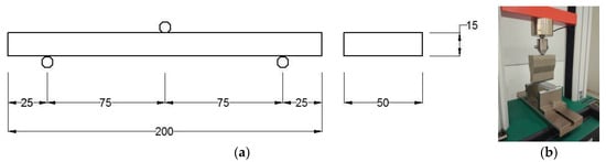 The flexural test were conducted 5–7 days after curing. The experiment was carried out on a 3-ton universal testing machine at a constant deflection control speed of 0.3 mm/min. Taking a 15 mm thick beam as an example, the three-point bending test setup can be seen in Figure 14. The effective span was 150 mm. The experiment was terminated once the load dropped below 50% of the peak load. The displacement movement of the machine was used to plot the load–displacement diagram