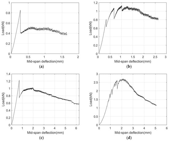 Load–deflection curves for 200 mm × 50 mm × 20 mm UHPFRC beams. (a) 1%-15-s6; (b) 1%-15-s4; (c) 2%-20-s8; and (d) 2%-20-s5.