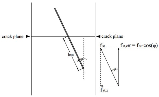 Apart from the tensile property of the UHPC matrix, both the fibre orientation and fibre volume content can determine whether the beam performs a load-hardening behaviour or not. Initially in the uniaxial tensile test, fibres were fully bonded, and the tensile load was mainly carried by the concrete matrix. Thus, the first crack tensile strength mainly depended on the tensile properties of the concrete matrix, which agrees with previous researchers [,]. After the concrete cracks, concrete hardly sustained any loads, but fibres were not pulled-out yet due to the static frictional force τ between fibres and the concrete matrix. With the increase of uniaxial tensile load, the static frictional force also increased. Whether the beam had a load-hardening or load-softening performance depends on whether the whole fibre–concrete interfaces can provide enough frictional force, while the frictional force is related to the roughness of the interface, number of fibres (fibre volume content), and effective embedment length (fibre orientation). As can be seen in Figure 16, the effective static frictional force fst,eff carried by one fibre can be estimated as: