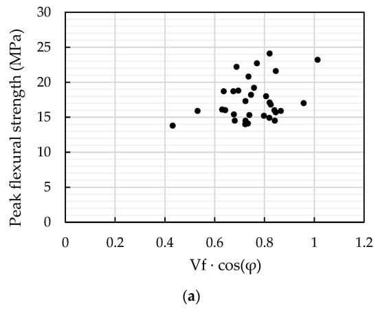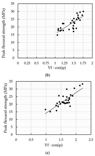 Relationship between Vfcos(φ) and peak flexural strength. (a) 1% vol. UHPFRC; (b) 2% vol. UHPFRC; and (c) 2.5% vol. UHPFRC.