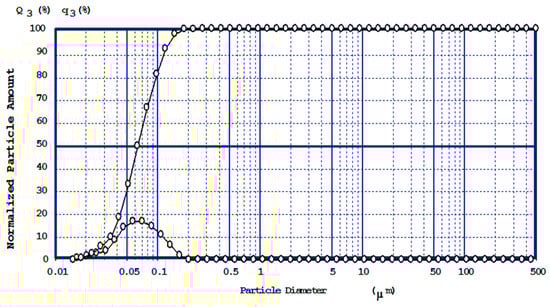 The particle size distribution of the particles was determined using a laser technique. The samples were dispersed by ultrasound for 10 min, and distilled water was used as the dispersion medium. During particle sizing, it was found that the particles were highly agglomerated and ultrasound can break up the particles effectively, as seen in Figure 3. Sizing showed that CaCO3 synthesized by double exchange reaction has the d50 of 0.05 µm, and particles with narrow diameters.