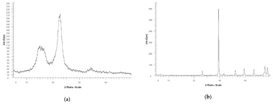By X-ray diffraction the calcite and vaterite CaCO3 crystals precipitated in the wall and/or lumen of the fibers was observed (Figure 4c). Regardless of the obtaining method, a significant reflection of calcite at 2θ = 29.3°, the (104) plane, and at 2θ = 39.4°, the (113) plane can be observed, in accordance with literature [14,42].