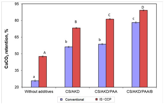CaCO3 retention for different additive systems in relation to paper composition. (different letters within the same method—small letters for conventional and capitals for IS-CCP designate statistical difference, p < 0.05).