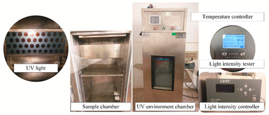 The UV aging test on asphalt was simulated by using a self-made UV environment apparatus (Changsha University of Science and Technology, Changsha, China). The temperature of sample chamber was controlled at 25 °C, the intensity of UV light was 14.2 mW/cm2. The exposed duration of samples was 7 days, which was equivalent to the UV radiation amount of three months in northwestern China known well as the high UV light intensity region. The self-made apparatus is presented in Figure 1, it consists of a UV light, a sample chamber, a light intensity controller a temperature controller, and a light intensity tester. The UV light has four rows, 10 UV-LED beads are installed in each row with filters inside to ensure the occupancy of UV light. There are cooling fans, heater, humidity and temperature testers inside the chamber. The light intensity controller can adjust the intensity of UV light and display accumulated duration, UV light intensity in the chamber can be measured by the light intensity tester. In this study, a circular disc with a diameter of 140mm is used as the asphalt sample tray, and the thickness of each binder sample is 1.5 mm. According to the formula (mass = bottom area × thickness × density), the mass of asphalt required for each sample was calculated and poured into the asphalt sample tray. After the leveling of asphalt surface, samples were cooled to a room temperature on a platform, finally samples were prepared to be exposed to the UV light via the self-made UV environment apparatus, each experimental group has five samples.
