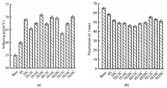 Basic physical properties testing results: (a) softening point, and (b) penetration.