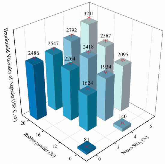 According to the industrial standard (JT/T 798-2011) in China, named as “Asphalt Rubber For Highway Engineering” [37], the results of Brookfield viscosity (180 °C) test are shown in Figure 3.