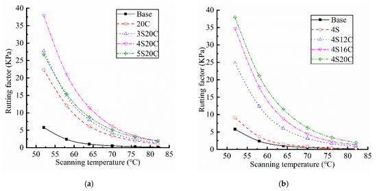 Figure 4 indicates that rutting factors of the single-doped modified asphalt (4S and 20C) are higher than that of base asphalt. The rutting factor of 4S20C is the largest in the compound modified asphalt, which is nearly five time larger than that of the base asphalt. The base asphalt has the poorest high-temperature displacement resistance due to its smallest rutting factor. The incorporation of 20% rubber powder greatly improves the high-temperature stability of asphalt. With the incorporation of nano-SiO2, the rutting factor of asphalt shows a trend of increase first and then decrease. When the content of nano-SiO2 is 4% in Figure 4a, the rutting factor reaches the maximum. Figure 4b shows that the rutting factor exhibits a very obvious improvement with the incorporation of rubber powder.