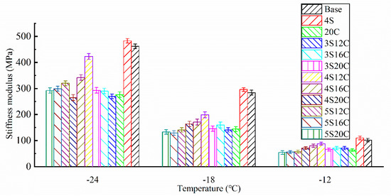 Stiffness modulus (S) of each group can be seen in Figure 5. The stiffness modulus increases as the test temperature decreases, the creep rate decreases as the test temperature decreases. This fact means that the asphalt becomes hard and brittle as the temperature decreases, and brittle cracking is likely to occur under external force.