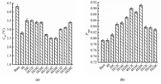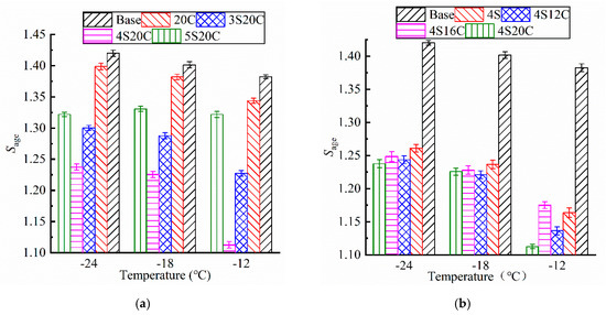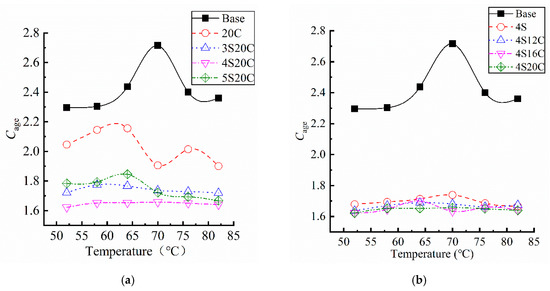 As shown in Figure 9, the Sage of all testing groups subjected to UV aging is greater than 1. Asphalt becomes brittle and hard as the stiffness modulus becomes larger, and the low-temperature cracking will be more likely to occur on asphalt pavement. The Sage of modified asphalt is smaller than that of the base asphalt, which implies that nano-SiO2 and rubber powder can protect the UV aging degradation on the low-temperature property of asphalt. In Figure 9a, the Sage of nano-SiO2 modified asphalt present obvious decrease than that of the base asphalt and 20C. Figure 9b expresses that the Sage of 4S12C, 4S16C, and 4S20C almost behave the same at −24 °C and −18 °C, which directs that the rubber powder is not sensitive to stiffness modulus increase due to UV aging. It is obvious that 4S20C must be chosen as the best compound ratio related to the lowest increase of stiffness modulus.