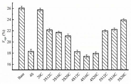 Figure 7 shows that minor anti-UV aging effect can be seen in rubber powder modified asphalt (20C) due to the carbon black, because the Vage of 20C is slightly lower than that of base asphalt. The Vage of nano-SiO2 modified asphalt decreases sharply with respect to other groups, this finding indicates that nano-SiO2 can effectively improve the anti-UV aging property of asphalt. However, the Vage starts to rise when nano-SiO2 content reaches 5%. Additionally, the Vage of 4S16C is the lowest, and the Vage of 4S20C is very close to that of 4S16C.