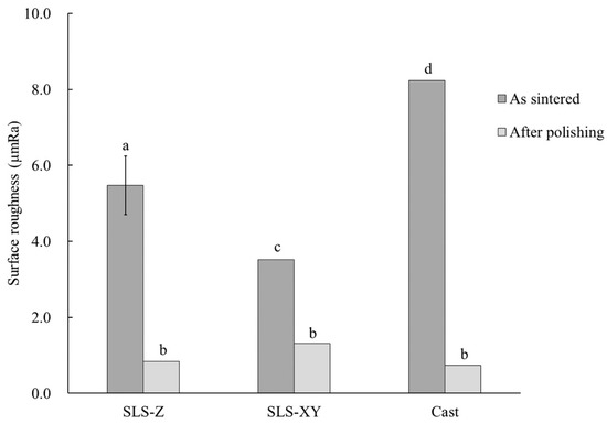 Table 3 shows the results of physical property test. A three-way ANOVA based on metal type (A), molding method (B), and surface condition (C) was performed to analyze their effect on surface roughness, contact angle, and Vickers hardness. Regarding surface roughness there were highly significant differences (p < 0.01) in the main effects B, C, and in the interaction B × C. Figure 3 shows a graph of B × C and the results of Tukey’s multiple comparison. As shown in Figure 3, the sintered surface roughness was in the descending order of cast > SLS-Z > SLS-XY. After polishing, these values were greatly reduced for all the molding methods, and there was no significant difference between the molding methods or among the building directions (p > 0.05).
