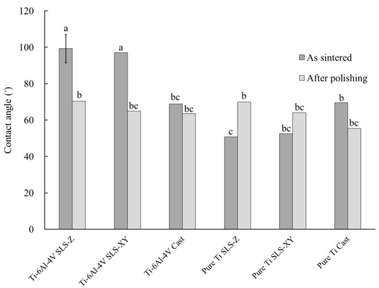 In Ti-6Al-4V SLS-molded specimens, the sintered contact angles were 90° or more, whereas that of the cast specimen was approximately 69°. After polishing, the contact angles were similar to that of the cast specimen before polishing, regardless of the molding method. Generally, the relationship between surface roughness and contact angle is expressed by the Cassie–Baxter Formula (2) [28]: