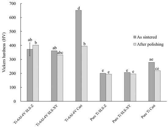 Regarding Vickers hardness, there was a significant difference (p < 0.05) in A × C, and a highly significant difference (p < 0.01) in all the other main effects and interactions. Figure 5 shows a graph of A × B × C and the results of Tukey’s multiple comparison. As shown in Figure 5, for Ti-6Al-4V, the sintered Vickers hardness of the SLS-Z and SLS-XY specimens was significantly lower (p < 0.01) than that of the cast specimen. After polishing, the Vickers hardness of the cast specimen was similar to those of the SLS-Z and SLS-XY specimens, and there was no significant difference between the molding methods or among the building directions (p > 0.05). The Vickers hardness of pure Ti was significantly smaller than that of Ti-6Al-4V in both SLS and casting method (p < 0.05).