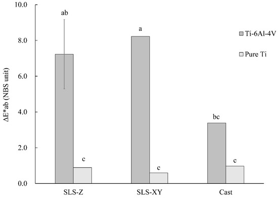 Regarding the color difference after immersion in lactic acid solution, there was a highly significant difference (p < 0.01) in main effect A, and a significant difference (p < 0.05) in the interaction A × B. Figure 6 shows a graph of A × B and the results of Tukey’s multiple comparison. As shown in Figure 6, for Ti-6Al-4V, the color differences of the SLS-Z and SLS-XY specimens were significantly (p < 0.05) larger than that of the cast specimen. For pure Ti, there was no significant difference between the molding methods or among the building directions (p > 0.05).