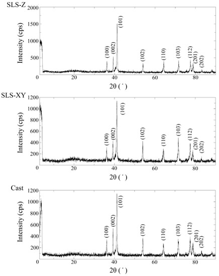 X-ray diffraction spectra of the SLS-Z, SLS-XY, and cast Ti-6Al-4V specimens.