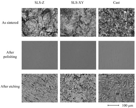 Digital microscope images of SLS-Z, SLS-XY, and cast Ti-6Al-4V specimens as sintered, after polishing, and after etching (×1000).