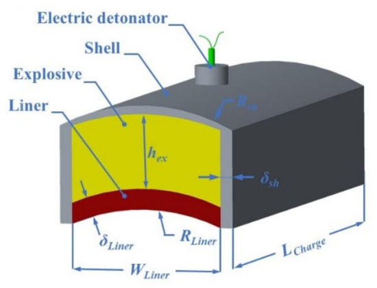 LSC is a strip-shaped charge structure, which is composed of a metal liner, insensitive explosive, and non-metallic shell. The LSC detonated at the center point. The center of the shell is perforated to insert the detonator to ensure that the detonator is in good contact with the explosive, as shown in Figure 1. RLiner, δLiner, Rsh, δsh, WLiner, hex, and LChanrge are the liner inner diameter, the liner thickness, the outer diameter of the shell base, shell thickness, charge width, charge height, and charge length, respectively.