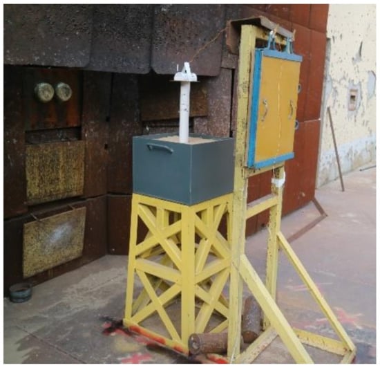 To obtain the shape and velocity of the LEFP after the LSC detonation, an X-ray test was carried out. Figure 3 is a layout diagram of a LSC X-ray test. The LSC was placed on a PVC cylinder that is situated in a sandbox. The height of the PVC cylinder was 300 mm. The LSC, PVC cylinder, and sandbox were placed between the X-ray exit and the imaging device. The imaging device was composed of an imaging plate and a protective cover.