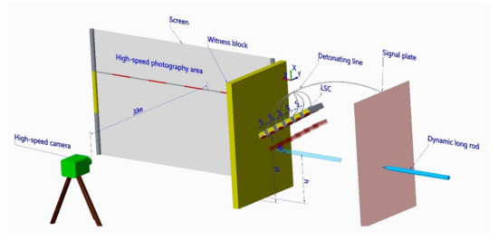 Multiple LSCs were arranged side by side at a certain inclination angle θ above the striking direction of the long-rod projectile, in which the spacing between adjacent LSCs was s, and the lowest linear-shaped charge was 200 mm above the ground (H = 200 mm). The signal plate was placed in front of the LSC. The backplane was a SHY685NS steel plate with a thickness of 30 mm, which is placed behind the LSC. The distance between the detonating plate and the backplane was 390 mm. The body of the long rod projectile was a tungsten alloy with a diameter of 10 mm. The striking height of the long-rod projectile was h. The long rod first hit the signal board, which transmits electrical signals to the electric detonators. The electric detonators simultaneously detonated multiple LSCs, and then formed the LEFPs sequence, resulting in the fracture of the long rod. The fractured rods penetrated the witness plate, which not only recorded the direction of penetration of the fractured rods, but also effectively isolated the scattering of detonation products and part of the detonation glare, facilitating the photographing of motion morphology of the fractured rods with a high-speed camera. The high-speed camera was placed 30 m away from the curtain. The test layout is shown in Figure 4.