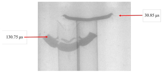 Figure 5 shows X-ray images captured at 30 and 130 μs after detonating the LSC. It can be seen that the LSC liner began to flip at 30 μs, and the detonation product has completed flipping at 130 μs to reach a stable flight status. The flight velocity of the LSC detonation product was calculated by X-ray photography to be about 850 m/s. Figure 6 shows the LSC detonation product collected in the X-ray experiment sandbox. It can be seen that the shape of the overturned molding of the liner was basically consistent with the X-ray images.