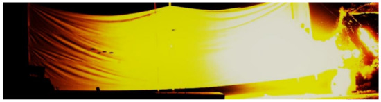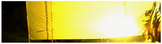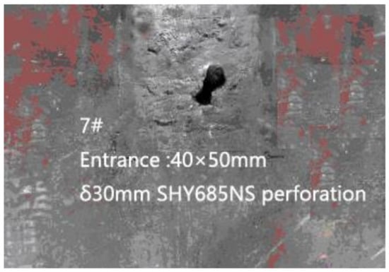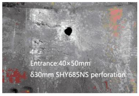 When the fractured rods passed through the backplane, the bullet hole appeared as a single hole expansion or multiple holes. Figure 8 is the photograph of the fractured bar penetrating the backplane in the fourth test, in which the bullet hole size was 40 mm × 50 mm. Figure 9 is the photography screenshot of the fractured bar penetrating the backplane in the seventh test, which has a bullet hole size of 40 mm × 70 mm. It can be seen that the size of the bullet holes on the backplane was all larger than the diameter of the dynamic long rod by 10 mm. Under the action of multiple LEFPs, the dynamic long rod all fractured, and the moving direction of the fractured rods changed to a certain extent, deviating from the initial trajectory direction and enlarging the incident hole of the backplane.