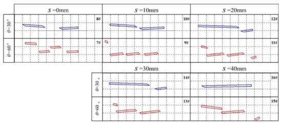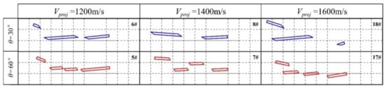 Figure 12 shows a screenshot of the position of the fractured residual rod on the screen captured by a high-speed camera at 26 ms after the dynamic long rod triggers the signal board, in which each dotted grid represents 50 mm × 50 mm. The velocity of the long rod was 1200 m/s. The length-to-diameter ratios of the long rod from left to right in the photo were L/D = 20, 26, and 35, and the interception angles from top to bottom were θ = 30° and 60°. The test number was marked in the upper right corner.