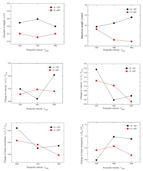 Figure 15 shows the fractured rods performance curve at different long rod velocities. It can be seen that the increase in the velocity of the long rod affected −∆L/L slightly. When θ = 30°, −∆L/L was higher than that of θ = 60°. In other words, when θ was small, the length loss rate of the fractured rod −ΔL/L was significant.