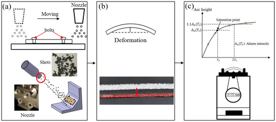 Almen intensity test process. (a) The strips are fixed on their holders. (b) After a certain amount of coverage, the strips are removed from the holders. The strips bend and extend. (c) This arc height is measured by the Almen gauge and Almen intensity is obtained by saturation curve.