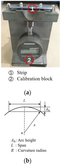 The total arc heights include two parts: deformation along the longitudinal direction, length 31.75 mm, and along the transverse direction, width 15.87 mm [6]. The relationship between the curvature radius R and the arc height Ah can be obtained by a geometrical analysis, as schematically displayed in Figure 3, which is expressed by Equation (3):
