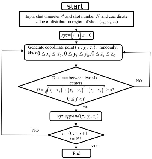 In an improved DEM-FEM impacting simulation, these discrete elements (PD3D) of a random shot are simulated only by their density ρ, radius R and coordinates of their centers x, y, z. To randomly generate the distributed shots, a python program (3.7.2) is combined with Abaqus/Explicit. This program requires as inputs the Almen strip peening space (x × y × z), shot number N and radius R. The z-axis is normal to this peening surface and directed towards the Almen strip. Assuming an (x × y × z) space, in the case of normal impacts, the coordinates of each shot center are randomly generated according to the Python program frame (Figure 7).