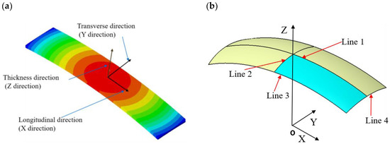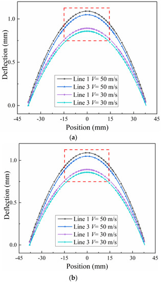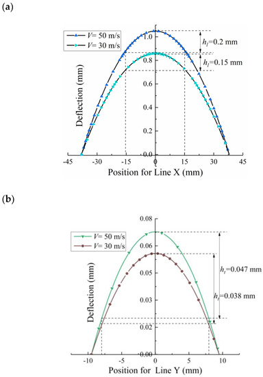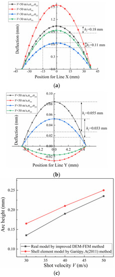 Figure 11a shows that the compressive residual stress pattern after shot peening is the same in the longitudinal direction (along X) and transverse direction (along Y). The calculated deflections of curvature can then be related to the arc height. For illustration, the deformed Almen strip can be idealized as a spherical surface. Suppose that there are four lines evaluated as the deflections along axes X and Y, as illustrated in Figure 11b. Figure 12a shows four curves of the Almen strip with different shot velocities after shot peening. It is obvious that Line 1 and Line 2 almost completely coincide, indicating that a spherical surface is present in the middle of the strip. Figure 12b shows that the deflections obtained by Line 3 are less than those obtained by Line 1.