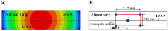 The arc height of the Almen strip can then be related to the deflection of lines X and Y, as shown in Figure 13a. In actual shot peening, the strips are subjected to the shot stream, and their free deflection over a 31.75 mm × 15.87 mm area is measured with an Almen gauge (see Figure 3). Thus, the longitudinal deflection and transverse direction of the rectangular contour area are used to calculate the arc height, as shown in Figure 13b.