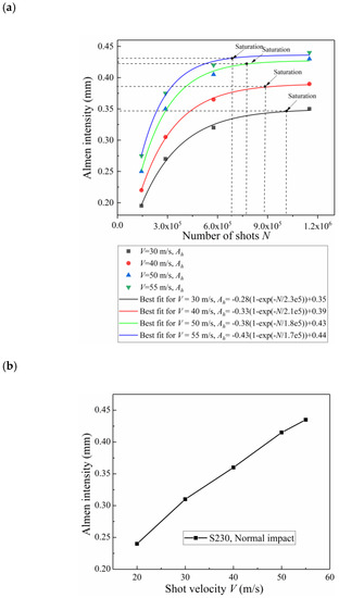 where Ah(Ns) is the Almen intensity. Figure 15a presents the saturation curves of the Almen strip with different shot velocities, corresponding to impingement angles α = 90°. The Almen intensity values increase as the shot velocity is increased from 30 to 55 m/s. Figure 15b shows that the shot velocity presents an almost linear trend with the Almen intensity, which is consistent with the experimental results presented by Miao and Demers [6].