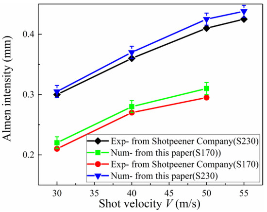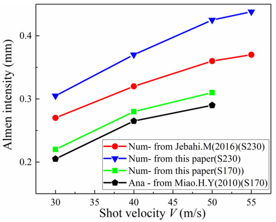 Figure 18 compares Almen intensity obtained by different methods as a function of shot velocity for two shot sizes: S170 steel shots (average diameter Dave = 0.504 mm), and S230 steel shots (Dave = 0.58 mm). Jebahi and Gakwaya [15] used a numerical method and elastic theory to calculate arc height and ignored the effect of transverse deformation by using Almen Type A strips and S230 steel shot. Miao and Larose [8] proposed an analytical model for predicting the Almen intensity and took the effect of transverse deformation into account by using Almen Type A strips and S170 steel shot.