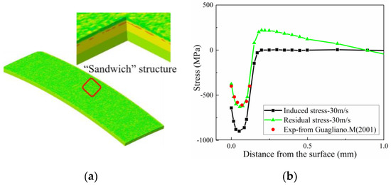 Removal constraints for the Almen strip. (a) “Sandwich” structure. (b) Comparison of the induced stress, residual stress from this paper and residual stress from Guagliano [16].