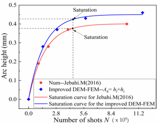 In the previous sections, an improved DEM-FEM model of a large number of shots was developed to simulate the process of Almen intensity testing at minimal cost. Using this model, a simulation method was proposed to correctly predict the Almen intensity from an actual Almen intensity test in the shot peening industry. To validate this improved DEM-FEM and methodology, a comparison between the numerical and experimental results from Almen intensity curves in the literature [27] are given in Figure 16. The saturation curve and the saturation point obtained by the improved method in this paper and considering transverse deformation are obviously greater than those obtained by Jebahi and Gakwaya [15]. Furthermore, the Almen intensity curves obtained by the improved method in this paper are very close to those from the Shotpeener Company.