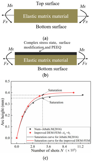 - Another of the main factors affecting the accuracy of arc height is the plastic layer. The real Almen strip solid element model is used instead of the representative unit, shell element and other equivalent models in this paper. The PEEQ, complex stress state, and surface morphology on the surface of the real Almen strip model are inherited by the Springback model. Moreover, for the existing method, the material model for calculating arc height is still the same elastic constitutive model as the material model before shot peening. However, the effect of surface hardening due to shot peening is not considered, as shown in Figure 20a. In fact, the residual stress, PEEQ and surface roughness on the surface of the real Almen strip are the mechanisms for improving the fatigue life after shot peening, as shown in Figure 20b. Ongtrakulkij and Khantachawana [28] reported that shot peening is a surface modification that can increase the bending strength by increasing the hardness and residual compressive stress. Bhuvaraghan and Srinivasan [4] proposed that the unit cell approach without superposition of the elastic theory is likely to provide accurate results when the thickness is high compared to the thickness of the plastic layer. It can be concluded that the surface morphology, complex stress state, and PEEQ of the plastic hardening layer influence the deformation of the strip. The saturation point obtained by the improved method in this paper and ignoring transverse deformation is slightly more than that obtained by Jebahi, Gakwaya et al. (2016), as shown in Figure 20c. This difference may be explained by the fact that PEEQ, the complex stress state and surface morphology of the plastic hardening layer decrease the bending stiffness of the strip. The influence of the plastic layer on deformation is about 10%. Currently, it is clear how the plastic hardening layer affects the arc height, and this factor should not be ignored. The proposed improved DEM-FEM approach can avoid this problem by considering the surface morphology, complex stress state, and PEEQ naturally.