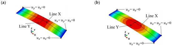 We now compare the real Almen strip model in this paper with the existing shell element method. The shell element method strategy presented by Gariépy and Larose [29] is applied to simulate peen forming operations on the Almen strip for comparison. When transverse deformation is not considered, the induced stress state in the longitudinal direction () is often selected as the input data to incrementally establish the deformed shapes, and the strip is in the shape of a saddle, as shown in Figure 21a. When transverse deformation is considered, the induced stress state in both directions ( and ) is selected as the input data to incrementally establish the deformed shapes, and the strip is spherical, as shown in Figure 21b.