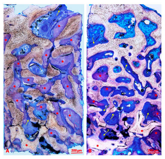 Overview of samples of the mineralized deproteinized bovine bone (DBMM) group (bar scale = 200 microns). Red asterisks are placed on blocks of biomaterials and yellow arrows indicate osteoid matrix. Blocks are surrounded by newly formed lamellar bone at different phases of mineralization. Blocks are easily recognizable and differentiable by bone that appears stained in shades of light brown and violet. (A,B) present differences in biomaterial amount, more represented in (A) than in (B), and consequent quantity of newly formed bone. Toluidine blue and pyronine yellow staining.